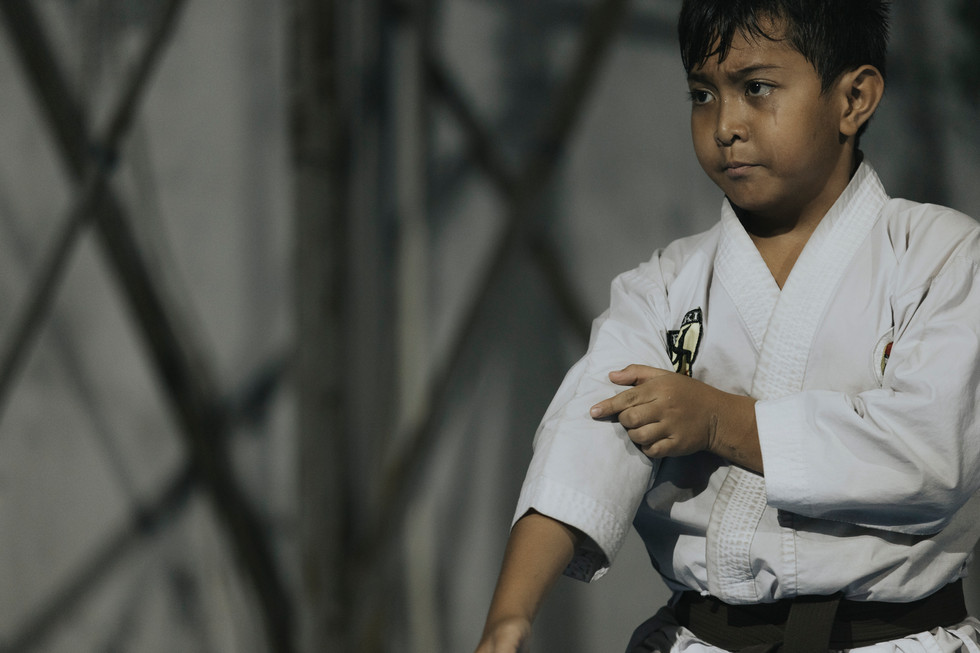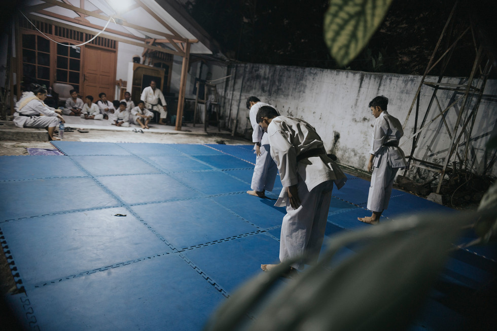 After the first match of my third stop in Jakarta, I have to run away from the arena because it's so cold inside that I'm starting to feel my sinuses ache... The air-conditioned shuttle hasn't left yet, so I choose to walk. The shortest way between the 5* hotel and the arena is through that "poor area." It's dark, there's smog in Jakarta right now, which is exactly 15 times above the WHO norm, so the atmosphere is a bit scary, but I end up turning off the main street anyway. People hang out in the alleys, eating rice from plastic bags on the ground, but everyone smiles and greets warmly. After a few minutes I hear really wild baby "screams" from a distance. I head in that direction and after a while I arrive at the ajar gate to the yard of a small bar. I look in there and find out that the screams were the "kyaaaaa" of young karatekas.
